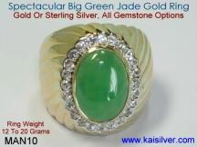 Impressive men's jadeite jade ring, custom made as a gold or 925 silver jade ring for men. The MAN125 jade ring is shown here with an untreated jadeite gem stone but, you could request for a dyed jade gem instead. Each jade ring is set with a natural green jade gem mined in Burma ... more.